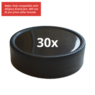Five black, plastic replacement lids for AllSpice spice jars.